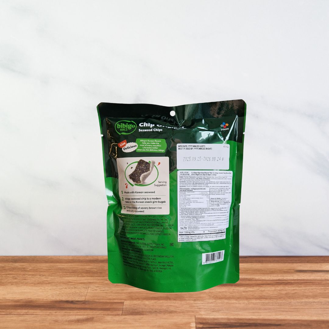 Ces chips sont préparées à partir d’algues gim coréennes, trempées dans un mélange de farine de riz et de tapioca, puis assaisonnées avant d’être frites. Le résultat : une texture fine, très croustillante, avec une saveur légèrement salée et umami.